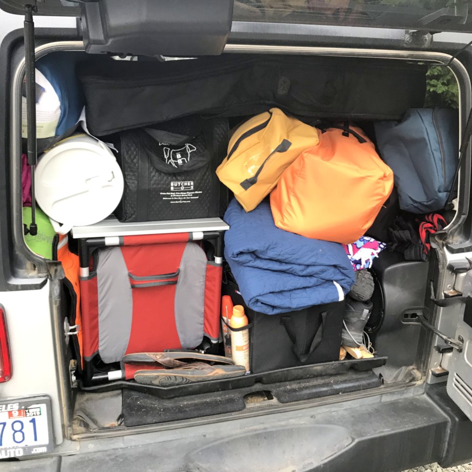 Once we had all the gear we wanted to take with us it was time to pack it all into the Jeep. We had no roof rack for this trip, so it was a challenge putting everything inside the Jeep. Thanks to my extensive knowledge and time spent on Tetris I was able to somehow cram everything into the Jeep, guitar included. Thankfully Kaitlyn was a good sport about having to share her seat with our two Chihuahuas, and with not having any real room in the back.