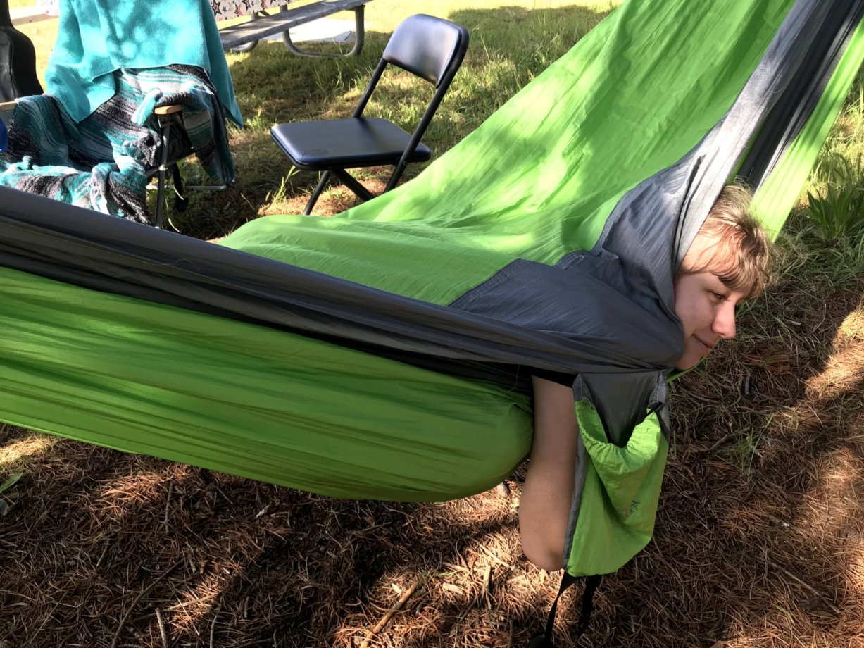 The next day Meghan made some great breakfast as we waited for our friends to join us for the day. We had a great time going on a walk, playing Bocce Ball, eating some great gumbo made by Meghan, and sitting around the camp fire chatting and eating S’mores. For the last day, I took my turn making breakfast while Meghan and Kaitlyn relaxed on hammocks and read. It was a nice clear day, and good way to start our last day there.