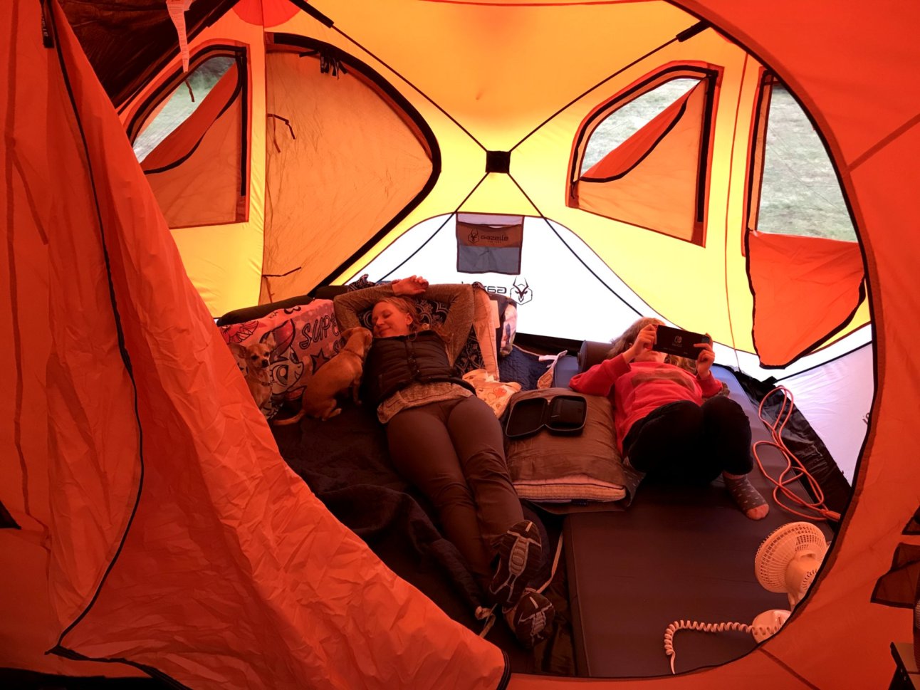 Once we got to the camp setting up the Gazelle T4 Plus Hub tent was pretty easy and straight forward. It helped that we had practiced how to set it up a few days before in our backyard. The beds, cooler, Camp Chef, and clothes bin were placed in the tent with no problems, other than the rain, but at least it wasn’t raining too hard while we were setting up. After everything was pretty much in place we used the fire pit to heat up some charcoal to make burgers and hot dogs. We relaxed for a bit and then went to bed.